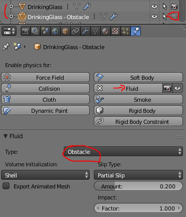 Make sure you turn rendering off for these obstacle objects. In the “Physics”-Tab select “Fluid” and choose “Obstacle” as type.