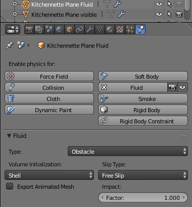 Although it is possible to use the objects we already created as obstacles in the simulation it sometimes can be more effective to create simplified versions of the objects as obstacles to reduce calculation time.  To illustrate this duplicate the objects drinking glass and the “wet” surface and name them “Drinking glass obstacle” and “kitchenette surface obstacle” or similar.