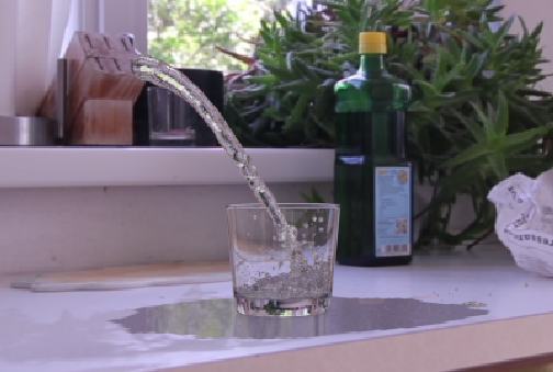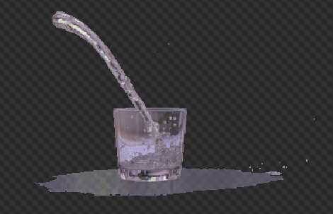 Since we have our surface set as obstacle we can modify our visible kitchenette surface and modify it to a wet ground. For that subdivide the visible plane several times and use extraction tools to shape it like a little water surface (see an example in the next section below the glass).
