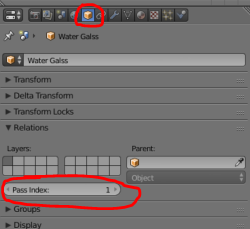 PassINdexFor the the drinking glass and the fluid domain set the PASS INDEX to 1 (object tab). For the water surface set the PASS INDEX to 2. Switch to “Nodes”-View and and select “World” in the bottom toolbar. Use the ID-Mask nodes to isolate a alpha map for the objects with the pass index 1 and two. Then use the “Set Alpha” node to isolate the object from the rendered image. We now can take the result from ID 2 and modify it with RGB curves and make it slightly transparent by using an Alpha Over. We place the result of the isolation in the foreground (lower image input) and the the upper image to black (0/0/0) with Alpha 0. We use the factor to make the water surface transparent. In our case I set this to 0.427. We then combine the water surface and the class with the water again with an Alpha Over and take the result as final render.