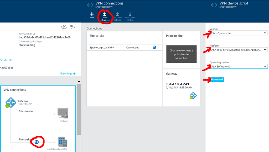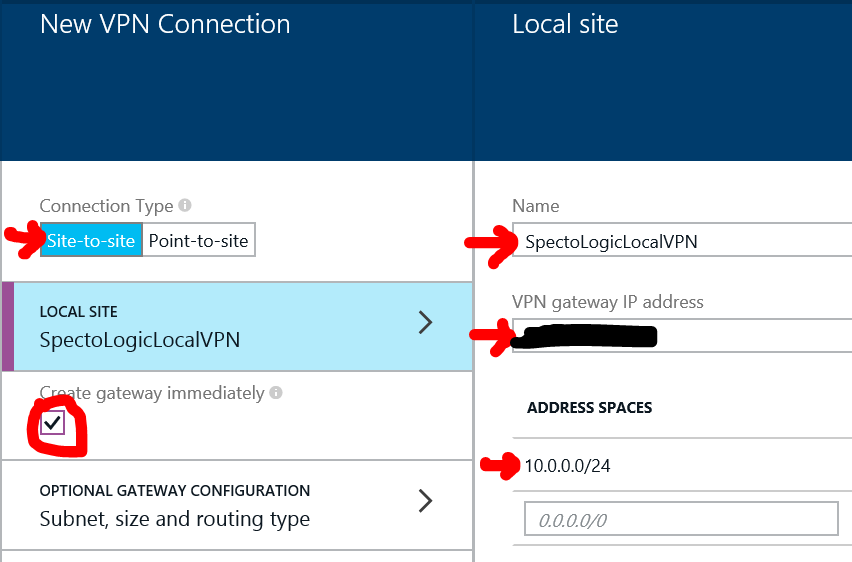 Now we need to configure our site to site connection by clicking into the VPN connection section. Inside the VPN Connection settings we select “Site-to-site” and give the local site a name (in our case “SpectoLogicLocalVPN”). As VPN gateway IP address we provide the public facing IP address of our ZyWALL 35 behind the internet modem. Finally we provide the address ranges of our local network we would like to connect. Due to a bug in the new Azure Portal you need to check “Create gateway immediately”*.