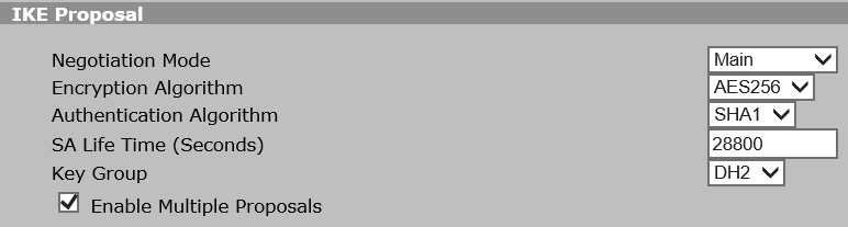 We leave the extended authentication settings untouched (uncheck “Enable Extended Authentication”) and configure the IKE Proposal.
