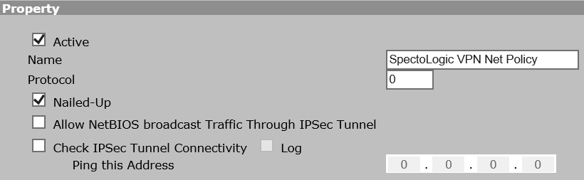 We name the VPN Network Policy “SpectoLogic VPN Net Policy” and set it to active (check that checkbox!). Also check “Nailed-up”!