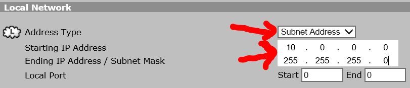 In the section “Local Network” we select “Subnet Address” from the “Address Type” dropdown and we provide the starting IP address in our local network and define the subnet mask for the range.
