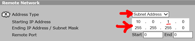 Now we also need to configure our remote network under the “Remote Network” section. Again we select “Subnet Address” from the “Address Type” dropdown and provide starting IP address and subnet mask: