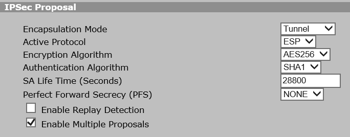 For the IPSec Proposal select the same values we already used for the VPN Gateway Policy (Exception: PFS set to NONE!):